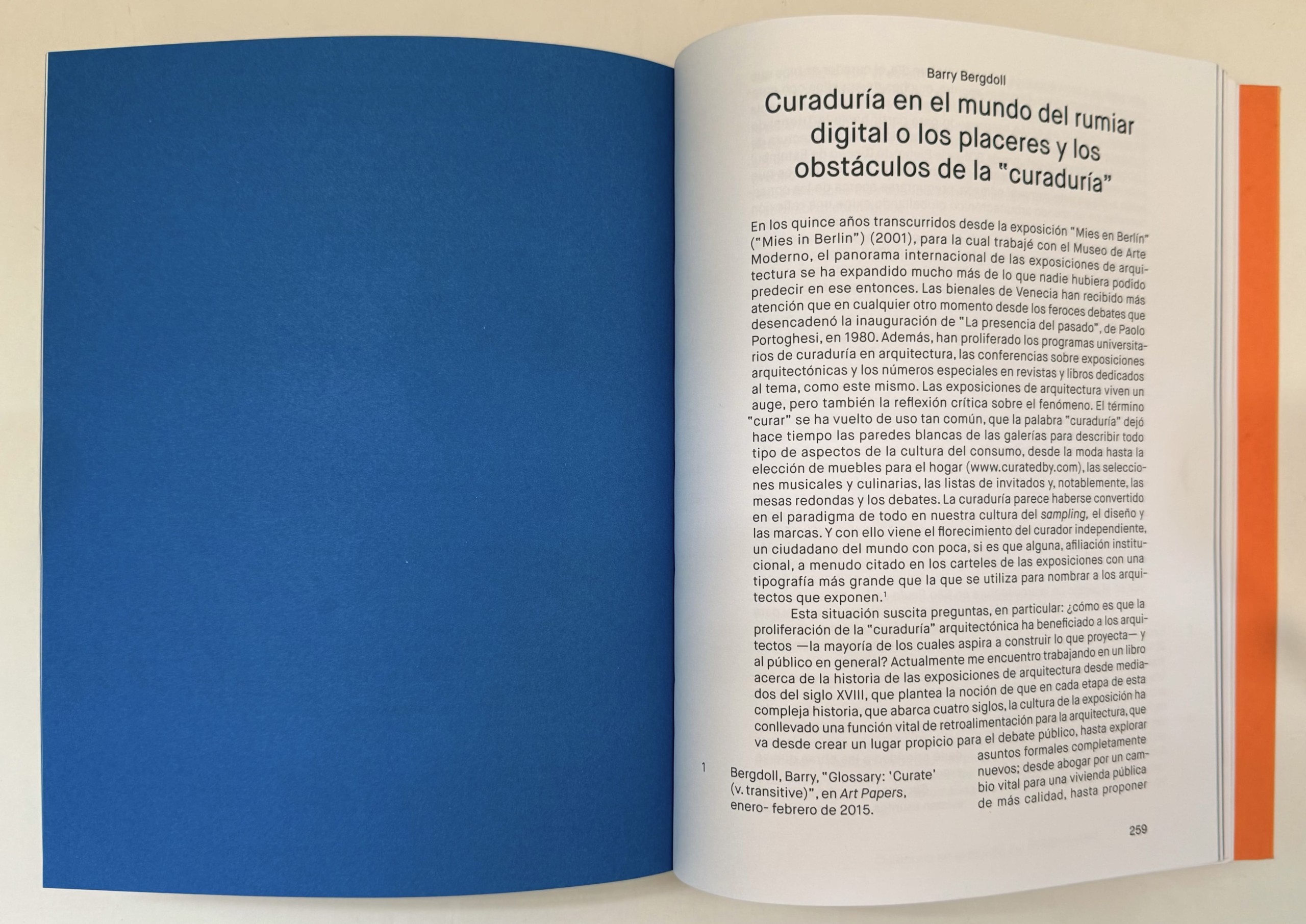 En los quince años transcurridos desde la exposición «Mies en Berlín» («Mies in Berlin») (2001), para la cual trabajé con el Museo de Arte Moderno, el panorama internacional de las exposiciones de arquitectura se ha expandido mucho más de lo que nadie hubiera podido predecir en ese entonces. Las bienales de Venecia han recibido más atención que en cualquier otro momento desde los feroces debates que desencadenó la inauguración de «La presencia del pasado», de Paolo Portoghesi, en 1980. Además, han proliferado los programas universitarios de curaduría en arquitectura, las conferencias sobre exposiciones arquitectónicas y los números especiales en revistas y libros dedicados al tema, como este mismo. Las exposiciones de arquitectura viven un auge, pero también la reflexión crítica sobre el fenómeno. El término «curar» se ha vuelto de uso tan común, que la palabra «curaduría» dejó hace tiempo las paredes blancas de las galerías para describir todo tipo de aspectos de la cultura del consumo, desde la moda hasta la elección de muebles para el hogar (www.curatedby.com), las selecciones musicales y culinarias, las listas de invitados y, notablemente, las mesas redondas y los debates. La curaduría parece haberse convertido en el paradigma de todo en nuestra cultura del sampling, el diseño y las marcas. Y con ello viene el florecimiento del curador independiente, un ciudadano del mundo con poca, si es que alguna, afiliación institucional, a menudo citado en los carteles de las exposiciones con una tipografía más grande que la que se utiliza para nombrar a los arquitectos que exponen.1