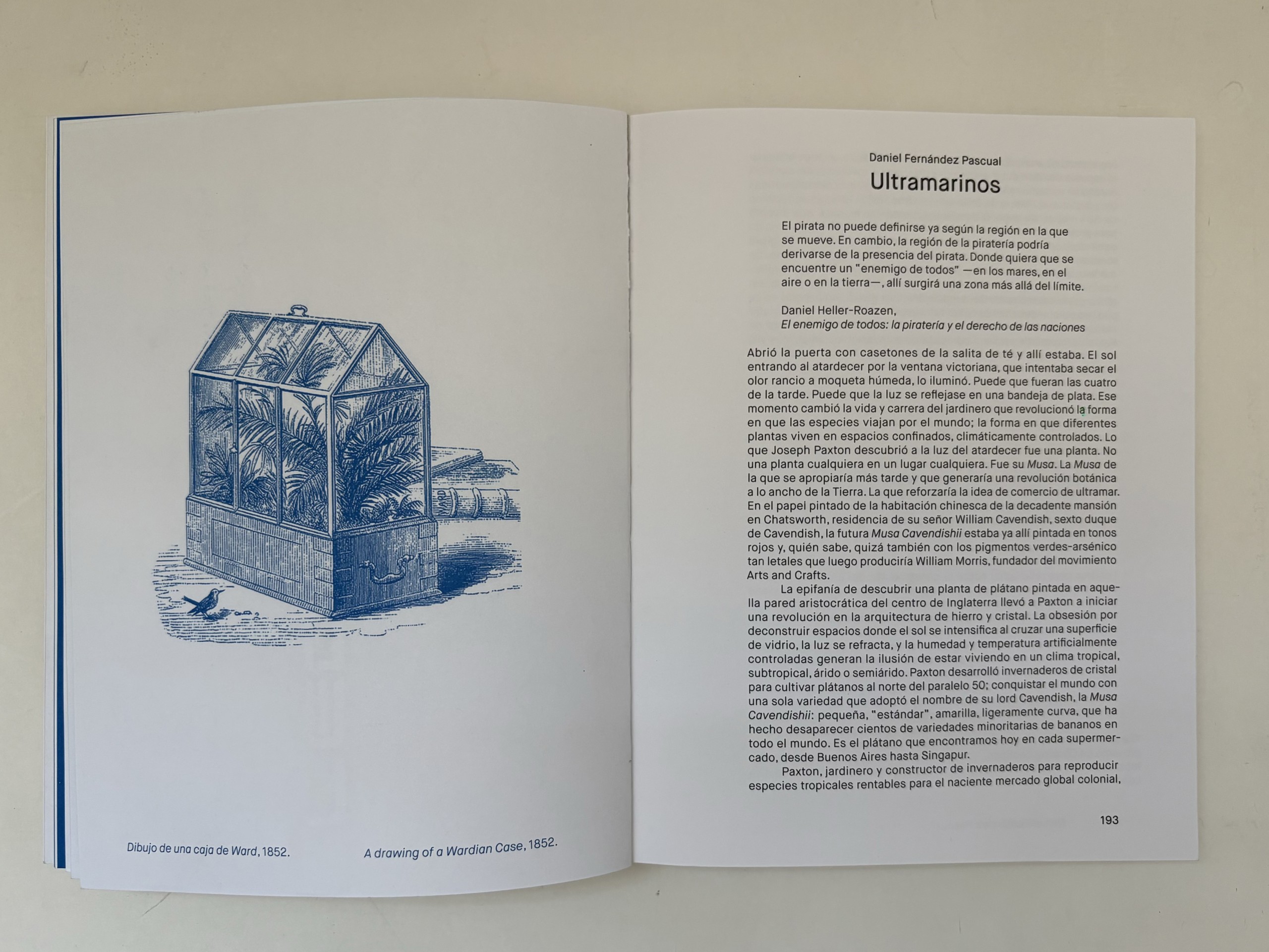 La epifanía de descubrir una planta de plátano pintada en aquella pared aristocrática del centro de Inglaterra llevó a Paxton a iniciar una revolución en la arquitectura de hierro y cristal. La obsesión por deconstruir espacios donde el sol se intensifica al cruzar una superficie de vidrio, la luz se refracta, y la humedad y temperatura artificialmente controladas generan la ilusión de estar viviendo en un clima tropical, subtropical, árido o semiárido. Paxton desarrolló invernaderos de cristal para cultivar plátanos al norte del paralelo 50; conquistar el mundo con una sola variedad que adoptó el nombre de su lord Cavendish, la Musa Cavendishii: pequeña, «estándar», amarilla, ligeramente curva, que ha hecho desaparecer cientos de variedades minoritarias de bananos en todo el mundo. Es el plátano que encontramos hoy en cada supermercado, desde Buenos Aires hasta Singapur.