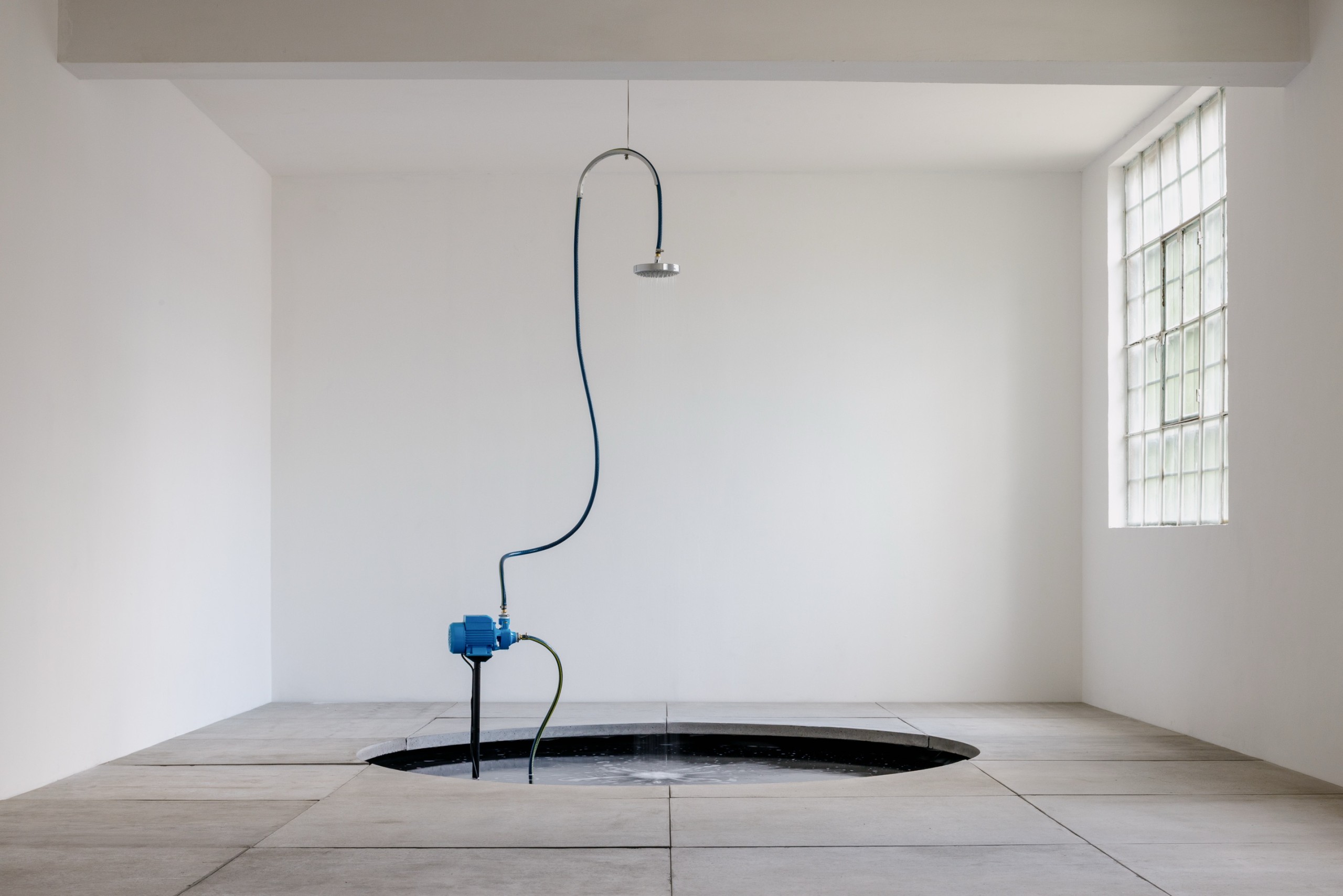 Esta forma circular negativa fue apropiada en esta arquitectura-arqueología por gru.a: diseñaron una superficie destinada a ser continuamente removida por las aguas de este chuveirão. Esta ducha es la quintaesencia de la gambiarra brasileña o, utilizando la definición de Claude Lévi-Strauss, el artefacto de un bricoleur: aquel que “ejecuta una obra usando medios y recursos que denotan la ausencia de un plan preconcebido” y que “siempre se las arregla con […] residuos de construcciones y destrucciones previas.”
